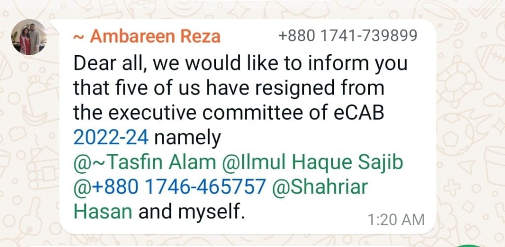 বাংলাদেশ কম্পিউটার সমিতির কার্যনির্বাহী কমিটির পদত্যাগের দশ দিনের মাথায়, বৃহস্পতিবার গভীর রাতে, ই-কমার্স অ্যাসোসিয়েশন অব বাংলাদেশের (ই-ক্যাব) পাঁচ সদস্য একযোগে পদত্যাগের ঘোষণা দিয়েছেন। রাত ১টা ২০ মিনিটে হোয়াটসঅ্যাপ গ্রুপে এই তথ্য শেয়ার করেন সংগঠনের ভাইস প্রেসিডেন্ট আম্বারিন রেজা।